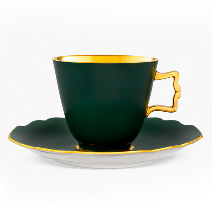 "Belvedere" coffee cup and saucer in forest green matte and 24K gold designed during the times when the Empress Maria Theresa owned the Augarten porcelain company. It was named after the Belvedere palace in Vienna. It exhibits the generations of unparalleled craftsmanship synonymous with the renowned Viennese house.