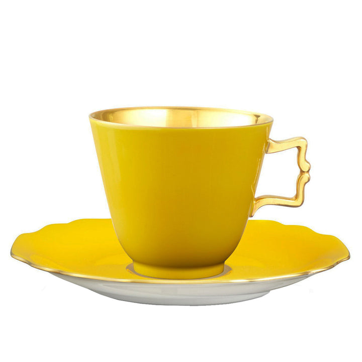 "Belvedere" coffee cup and saucer in yellow and 24K gold designed during the times when the Empress Maria Theresa owned the Augarten porcelain company. It was named after the Belvedere palace in Vienna. It exhibits the generations of unparalleled craftsmanship synonymous with the renowned Viennese house.