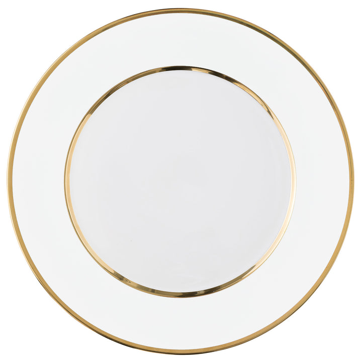 "Schubert" charger hand-painted in white with 24K gold band. Designed during the Biedermeier era, a period in the 19th century that captured the true spirit of the “Viennese” style of the time. Composers Schubert and Strauss, artist Waldmüller and poets Grillparzer and Raimund all had an influence on the Biedermeier era. A strong sense of family and comfort led to the particular move towards silverware, beautiful glass and exquisite porcelain. This classic and timeless design exhibits elegant simplicity with a nod to modernity.