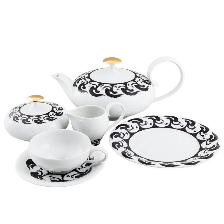 Tea set, part of the “Vogelkolonie” collection presented by Augarten as part of 100th anniversary celebration of Koloman Moser’s death. Originally created for the legendary Viennese fabric producer Backhausen the design of black and white swans intricated into each other is applied to shapes of "Ena" collection designed by Ena Rottenberg. 24K gold knob. Also available with platinum knob. The set includes one tea pot, one creamer, one sugar bowl, two cups and saucers and two dessert plates.