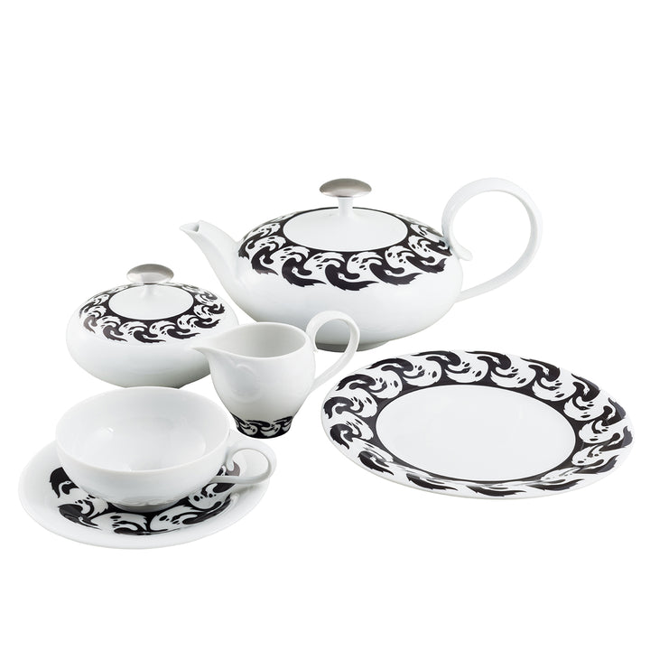 Tea set, part of the “Vogelkolonie” collection presented by Augarten as part of 100th anniversary celebration of Koloman Moser’s death. Originally created for the legendary Viennese fabric producer Backhausen the design of black and white swans intricated into each other is applied to shapes of "Ena" collection designed by Ena Rottenberg. Platinum knob. Also available with 24K gold knob. The set includes one tea pot, one creamer, one sugar bowl, two cups and saucers and two dessert plates.