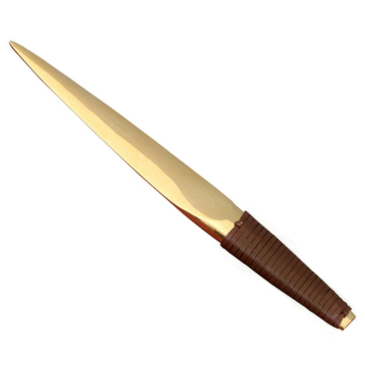 Leather-wrapped "Paper Knife" #4233 letter opener designed by Carl Auböck. His timeless mid-century objects were favorites of Bauhaus founder Walter Gropius, who displayed several of them on his desk. This incredibly refined and sculptural piece is cast in solid brass from the original cast and wrapped in natural cane or leather. It carries the Werkstätte Carl Auböck stamp.