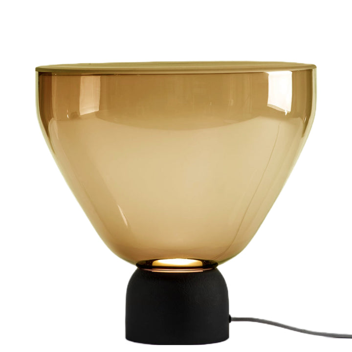 "Lightline" amber medium table lamp fashioned from mouth-blown glass designed by Lucie Koldova is a celebration of glass as an artistic medium. The concept of a line of light is rooted in the varying characteristics of the material and its forms. The design employs the effect of light uniformly dispersed over a sandblasted surface, which in profile creates the impression of a luminous line. The LED light source is embedded in the base beneath a metal and triplex-opal glass shroud. The upper surface, sandblasted by hand, is treated with a special nano coating to prevent the accumulation of dust and smudges. The collection comprises four lamps intended for the table or floor casting a light of intimate character.
